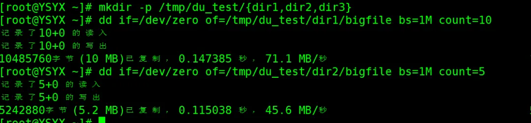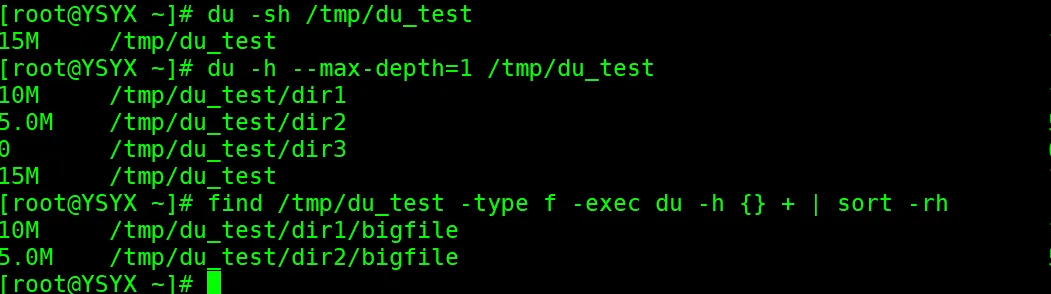 # 创建测试目录结构mkdir -p /tmp/du_test/{dir1,dir2,dir3}dd if=/dev/zero of=/tmp/du_test/dir1/bigfile bs=1M count=10dd if=/dev/zero of=/tmp/du_test/dir2/bigfile bs=1M count=5