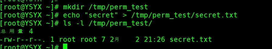 # 创建测试环境mkdir /tmp/perm_testecho "secret" > /tmp/perm_test/secret.txt# 查看当前权限ls -l /tmp/perm_test/