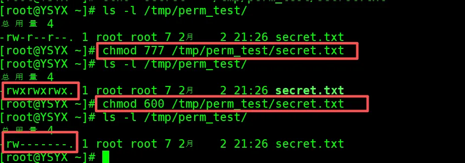 # 修改权限实验chmod 777 /tmp/perm_test/secret.txtls -l /tmp/perm_test/chmod 600 /tmp/perm_test/secret.txtls -l /tmp/perm_test/