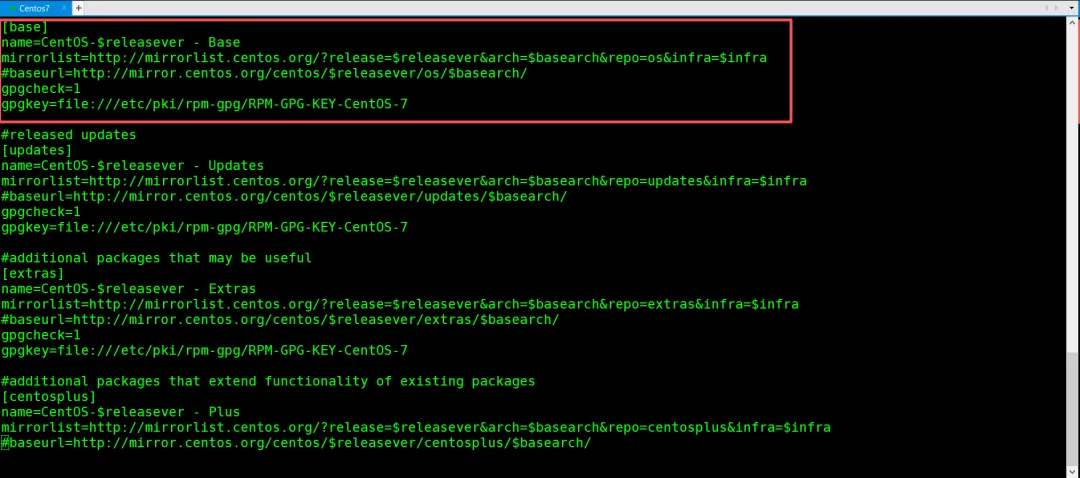 [base]name=CentOS-$releasever- Basebaseurl=http://mirror.centos.org/centos/$releasever/os/$basearch/gpgcheck=1gpgkey=file:///etc/pki/rpm-gpg/RPM-GPG-KEY-CentOS-7
