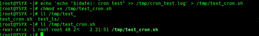 # 创建一个测试脚本echo 'echo "$(date): cron test" >> /tmp/cron_test.log' > /tmp/test_cron.shchmod +x /tmp/test_cron.sh