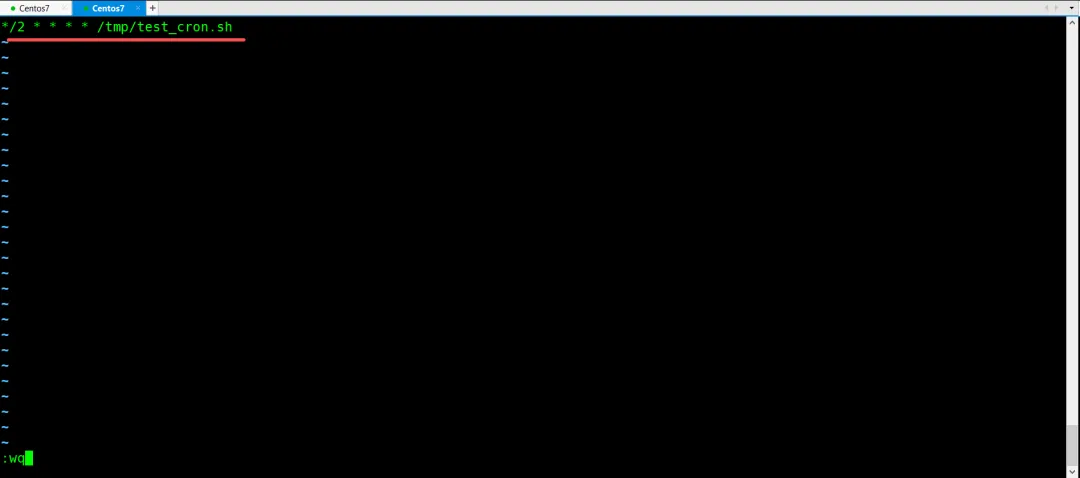# 编辑crontabcrontab -e# 按i输入,添加一行:*/2 * * * * /tmp/test_cron.sh#按Esc键退出到命令模式,输入:wq保存
