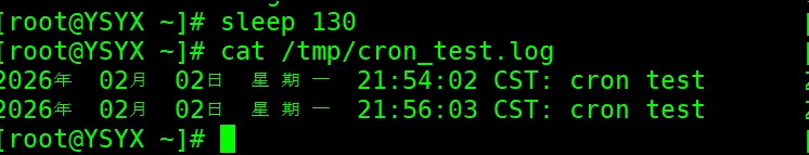 # 等待几分钟查看结果sleep 130cat /tmp/cron_test.log