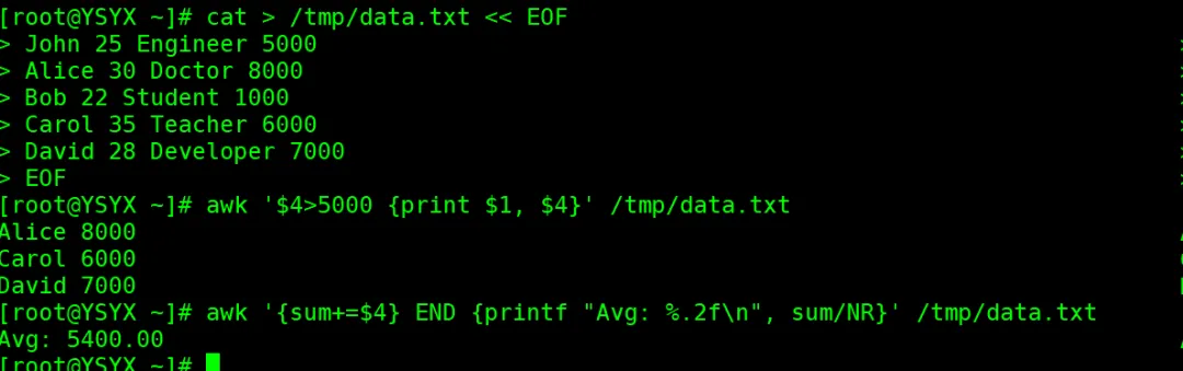 # 使用awk处理awk '$4>5000 {print $1, $4}' /tmp/data.txtawk '{sum+=$4} END {printf "Avg: %.2f\n", sum/NR}' /tmp/data.txt