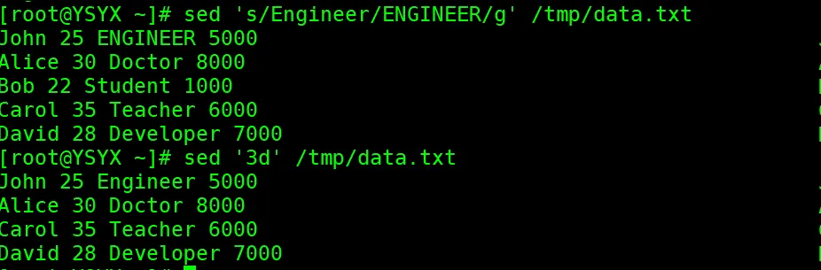 # 使用sed处理sed 's/Engineer/ENGINEER/g' /tmp/data.txtsed '3d' /tmp/data.txt