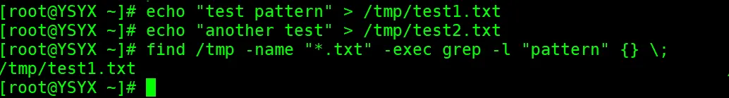 # 使用find和grep组合echo "test pattern" > /tmp/test1.txtecho "another test" > /tmp/test2.txtfind /tmp -name"*.txt"-execgrep-l"pattern" {} \;