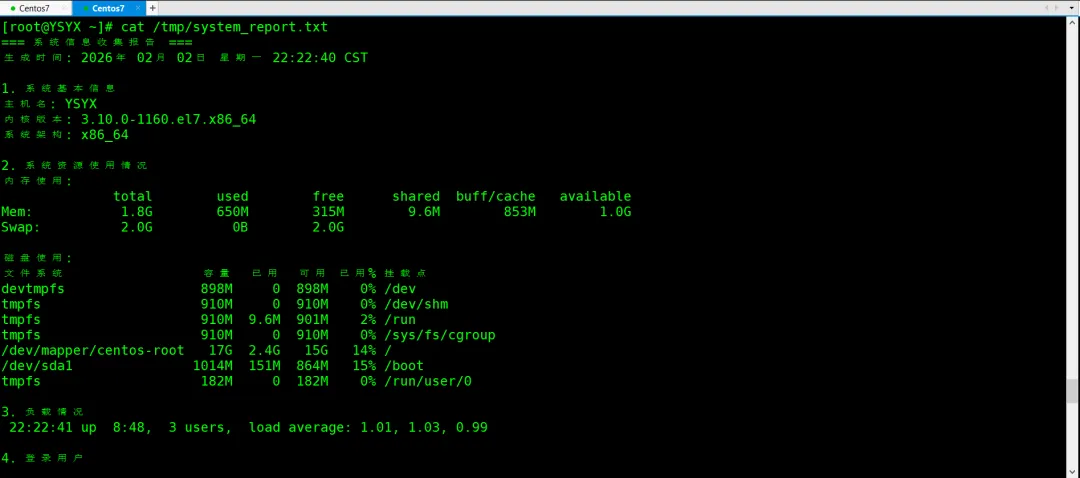 vim /tmp/system_info.sh#将以下内容复制粘贴进去,:wq保存#!/bin/bash# 保存为 /tmp/system_info.shecho "=== 系统信息收集报告 ==="echo "生成时间: $(date)"echo ""echo "1. 系统基本信息"echo "主机名: $(hostname)"echo "内核版本: $(uname -r)"echo "系统架构: $(uname -m)"echo ""echo "2. 系统资源使用情况"echo "内存使用:"free -hecho ""echo "磁盘使用:"df -hecho""echo "3. 负载情况"uptimeecho ""echo "4. 登录用户"whoecho ""echo "5. 内存占用前10的进程"ps aux --sort=-%mem | head -11echo ""echo "6. CPU占用前10的进程"ps aux --sort=-%cpu | head -11echo ""echo "7. 网络连接"ss -tun | wc-lecho "ESTABLISHED连接数: $(ss -t state established | wc -l)"echo ""echo "8. 系统服务状态"systemctl list-units --type=service--state=running | head -10