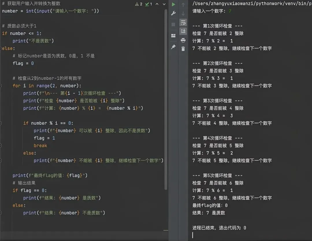 4.循环从2到number-1,判断是否能被其中任意一个数整除,如果能,则不是质数,将flag设为1并跳出循环。