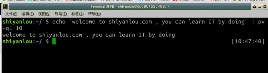 $echo"welcome to shiyanlou.com , you can learn IT by doing" | pv -qL 10