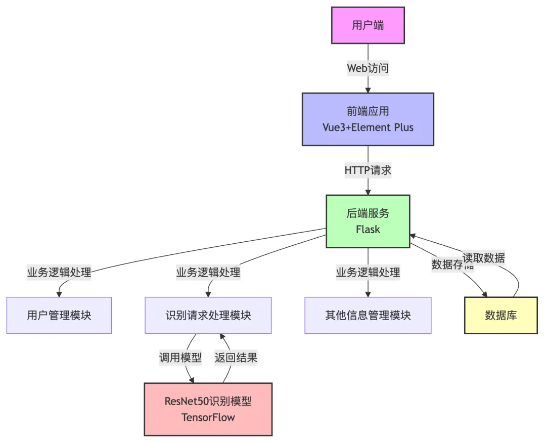 本植物识别系统是一款基于深度学习技术的智能植物识别应用,旨在帮助用户快速、准确地识别各类植物。系统采用前后端分离架构,前端使用 Vue3 框架结合 Element Plus 组件库,提供美观、直观的用户界面;后端采用 Flask 轻量级 Web 框架,负责处理业务逻辑和数据交互;核心识别算法基于 TensorFlow 框架实现的 ResNet50 深度学习模型,具备强大的图像特征提取和分类能力。
