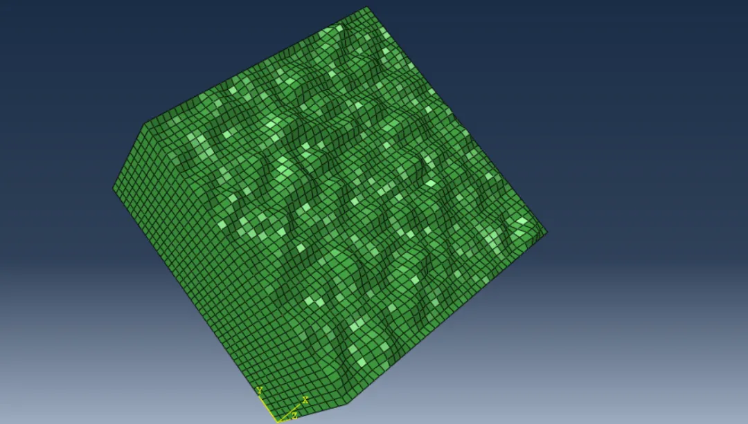 # -*- coding: utf-8 -*-"""Abaqus 3D 随机粗糙表面建模脚本参考来源:MATLAB 脚本 Rand_surf (Youngbin LIM)功能:基于 Weibull 分布和样条插值生成具有随机粗糙顶面的六面体实体模型"""from abaqus import *from abaqusConstants import *import numpy as npfrom scipy.special import gammafrom scipy.interpolate import RectBivariateSplinedef generate_bottom_up_hex_mesh(Lx, Ly, sn_x, sn_y, WB_a, WB_b, N, z_offset, num_layers): """ 核心计算函数:生成三维网格的节点坐标和单元拓扑关系 参数说明: Lx, Ly: 模型在 X 和 Y 方向的长度 sn_x, sn_y: 原始随机采样的点数 WB_a: Weibull 分布的尺度参数 (Scale parameter),影响起伏高度 WB_b: Weibull 分布的形状参数 (Shape parameter),影响分布形态 N: 插值细分倍数,用于控制最终网格密度 z_offset: 基础厚度,确保粗糙面下方有实心基座 num_layers: Z 方向(厚度方向)的等分数/层数 """ # 1. 随机高度场生成 # U: 0-1 之间的均匀随机矩阵 U = np.random.rand(sn_y, sn_x) # 计算均值偏置:Weibull 分布的期望值为 $a \cdot \Gamma(1 + 1/b)$ mean_offset = -WB_a * gamma(1 + 1 / WB_b) # 利用逆变换采样生成符合 Weibull 分布的高度值 $Z = a \cdot [-\ln(1-U)]^{1/b}$ Z_raw = mean_offset + WB_a * (-np.log(1 - U)) ** (1 / WB_b) # 2. 边界处理与插值 # 在四周填充一圈 0,确保模型边缘对齐(类似于周期性边界的简化处理) Z_padded = np.pad(Z_raw, pad_width=1, mode='constant', constant_values=0) # 定义插值的原始坐标点 x_p = np.linspace(0, Lx, sn_x + 2) y_p = np.linspace(0, Ly, sn_y + 2) # 使用双三次样条插值 (Bivariate Spline) 平滑表面 interp_func = RectBivariateSpline(x_p, y_p, Z_padded.T) # 3. 生成最终网格坐标 nx, ny = (sn_x + 2) * N, (sn_y + 2) * N x_new = np.linspace(0, Lx, nx) y_new = np.linspace(0, Ly, ny) # 计算顶层粗糙面的实际 Z 坐标 Z_top = interp_func(x_new, y_new).T + z_offset # 4. 节点生成逻辑 (自底向上) nodes = [] node_id_map = np.zeros((num_layers + 1, ny, nx), dtype=int) node_count = 1 for k in range(num_layers + 1): fraction = k / float(num_layers) # 当前层的高度比例 for j in range(ny): for i in range(nx): # Z 坐标从 0 按比例增长到顶层的随机高度 z = Z_top[j, i] * fraction nodes.append([node_count, x_new[i], y_new[j], z]) # 记录节点 ID,方便后续构建单元 node_id_map[k, j, i] = node_count node_count += 1 nodes = np.array(nodes) # 5. 单元生成逻辑 (8节点六面体 C3D8) elements = [] elem_count = 1 for k in range(num_layers): # 遍历每一层 for j in range(ny - 1): # 遍历 Y 方向 for i in range(nx - 1): # 遍历 X 方向 # 按照 Abaqus 六面体单元的节点编号顺序定义连接关系 (底面4点+顶面4点) n1 = node_id_map[k, j, i] n2 = node_id_map[k, j, i + 1] n3 = node_id_map[k, j + 1, i + 1] n4 = node_id_map[k, j + 1, i] n5 = node_id_map[k + 1, j, i] n6 = node_id_map[k + 1, j, i + 1] n7 = node_id_map[k + 1, j + 1, i + 1] n8 = node_id_map[k + 1, j + 1, i] elements.append([elem_count, n1, n2, n3, n4, n5, n6, n7, n8]) elem_count += 1 elements = np.array(elements) return nodes, elementsdef create_abaqus_model(nodes, elements, model_name='RoughSurfaceModel'): """ Abaqus API 交互函数:将计算数据转化为 CAE 模型 """ # 清理已存在的同名模型 if model_name in mdb.models.keys(): del mdb.models[model_name] myModel = mdb.Model(name=model_name) # 创建 Part (3D, 可变形体) myPart = myModel.Part(name='HexMeshPart', dimensionality=THREE_D, type=DEFORMABLE_BODY) print('Adding nodes...') # 逐一添加节点,必须指定 label 以保持与计算出的 ID 一致 for node in nodes: node_id = int(node[0]) coords = (float(node[1]), float(node[2]), float(node[3])) myPart.Node(coordinates=coords, label=node_id) print('Adding elements...') # 关键步骤:Abaqus 创建单元需要 MeshNode 对象,而不是整数 ID # 这里通过字典建立 Label -> Node 对象的快速映射 node_dict = {} for n in myPart.nodes: node_dict[n.label] = n # 逐一创建 HEX8 单元 for elem in elements: elem_id = int(elem[0]) node_ids = [int(n) for n in elem[1:]] # 将 ID 列表转换为 Node 对象元组 node_objects = tuple([node_dict[nid] for nid in node_ids]) myPart.Element(nodes=node_objects, elemShape=HEX8, label=elem_id) # 设置单元集合 (Set) all_elements = myPart.elements myPart.Set(elements=all_elements, name='AllElements') # 定义材料属性 (钢材示例) myMaterial = myModel.Material(name='Steel') myMaterial.Elastic(table=((210000.0, 0.3),)) # 杨氏模量, 泊松比 # 定义并指派截面属性 (Section) mySection = myModel.HomogeneousSolidSection( name='SolidSection', material='Steel', thickness=None ) myPart.SectionAssignment( region=myPart.sets['AllElements'], sectionName='SolidSection' ) # 创建装配体 (Assembly) myAssembly = myModel.rootAssembly myAssembly.DatumCsysByDefault(CARTESIAN) myInstance = myAssembly.Instance(name='HexMesh-1', part=myPart, dependent=ON) # 打印成功信息 print('=' * 60) print('Mesh created successfully!') print('Model name: %s' % model_name) print('Total nodes: %d' % len(nodes)) print('Total elements: %d' % len(elements)) print('=' * 60) return myModel, myPartif __name__ == '__main__': # 建模参数配置 params = { 'Lx': 10.0, # X 长度 'Ly': 10.0, # Y 长度 'sn_x': 20, # X 方向初始随机点数 'sn_y': 20, # Y 方向初始随机点数 'WB_a': 0.3, # Weibull 幅值系数 'WB_b': 2.0, # Weibull 形状参数 'N': 2, # 网格细分倍数 (nx = (sn_x+2)*N) 'z_offset': 5.0, # 基座高度 'num_layers': 10 # 厚度方向分10层 } # 执行生成流程 nodes, elements = generate_bottom_up_hex_mesh(**params) model, part = create_abaqus_model(nodes, elements)