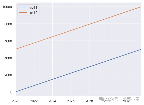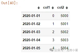 df1 = pd.DataFrame({"col1": np.arange(5000),"col2": np.arange(5000,10000)}, index=pd.date_range(start="2020-01-01",periods=5000) ) df1.head()
