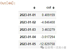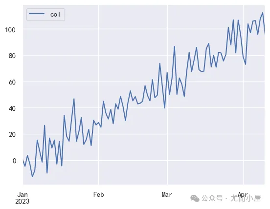 # 索引index = pd.date_range("2023-01-01",periods=100)# 基础线性数据base = np.linspace(0,100,100)# 添加随机噪声np.random.seed()noise = np.random.normal(0,10,100) # 均值为0-标准差为10的正态分布噪声数据# 时间序列数据 df2 = pd.DataFrame({"col": base + noise}, index=index)df2