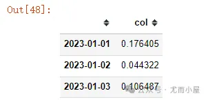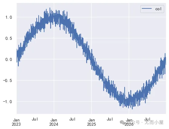 # 设置时间范围 index = pd.date_range('2023-01-01', periods=1460) # 生成基础数据 base = np.sin(np.linspace(0, 2 * np.pi, 1460)) # 生成一年的正弦波 # 添加随机噪声 np.random.seed(0) noise = np.random.normal(0, 0.1, 1460) # 生成时间序列数据 df3 = pd.DataFrame({"col": base + noise}, index=index)df3