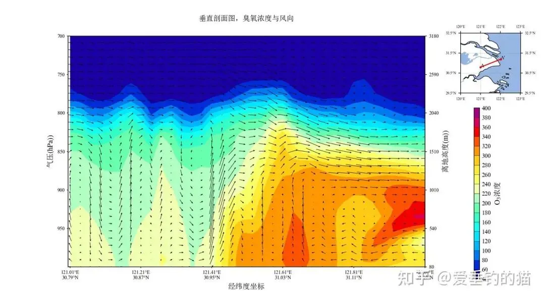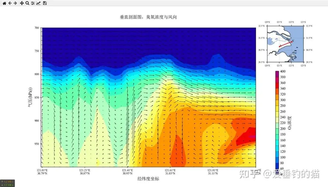 图中填色的内容是臭氧浓度,箭头表示剖切面的风速,右上角的红色线条表示剖切面。因此我们首先需要读取数据,然后对数据进行插值与处理,最后才是根据数据绘制图形。