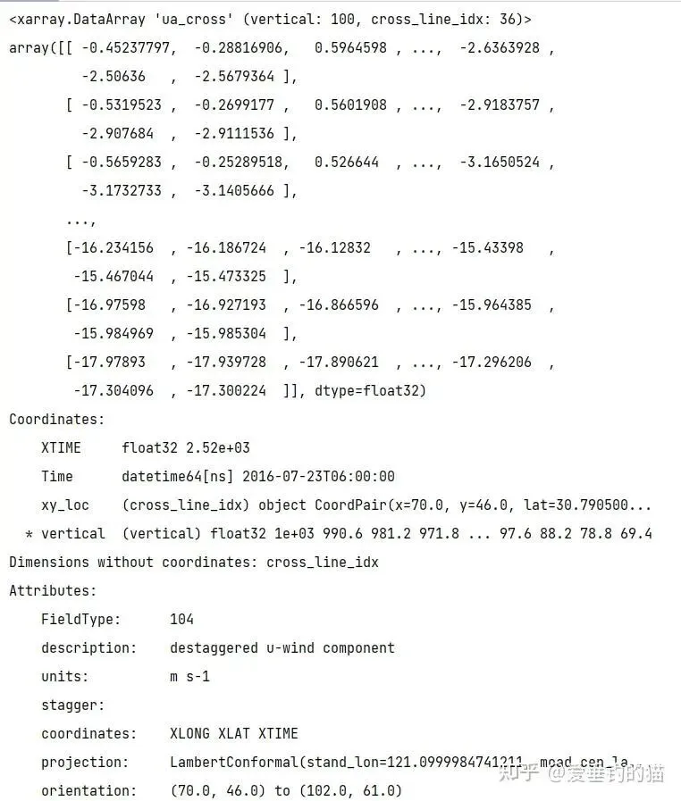 输出的数据结果如下图,是一个xarray.DataArray对象。除了数据本身以外还包含坐标信息,而这个坐标包含两维,xy_loc表示横向的数据,即沿着剖切线方向的各个点的经纬度;vertical表示垂直方向的坐标,单位是hPa,由大到小。由于数据本身并不规整,并且xarray数据本身插值即存在一定不严格的情况,导致插值数据的起始经纬度与用户设置的会有一些出入,属于正常现象。只要初始经纬度都在数据所包括的范围内,就不会有太大问题。