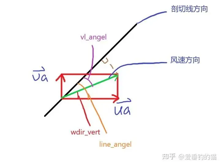 最终要满足的就是让风速*vl_angel从而投影到剖切线方向。ws_vert是一个正值,不需要在这里考虑风速的方向,因为最后在剖切线上的正负值是由vl_angel来负责的。需要注意的是在使用np.cos的时候要将弧度转换为角度。而np.arctan2是个很好用的函数,可以自动输出360°的arctan值。