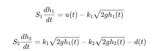 在工业工程控制应用中,双容水箱是一个典型的二阶耦合控制对象。其动力学行为遵循以下公式: