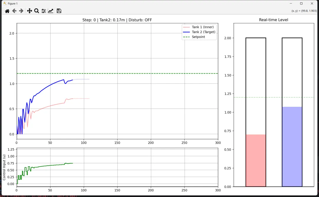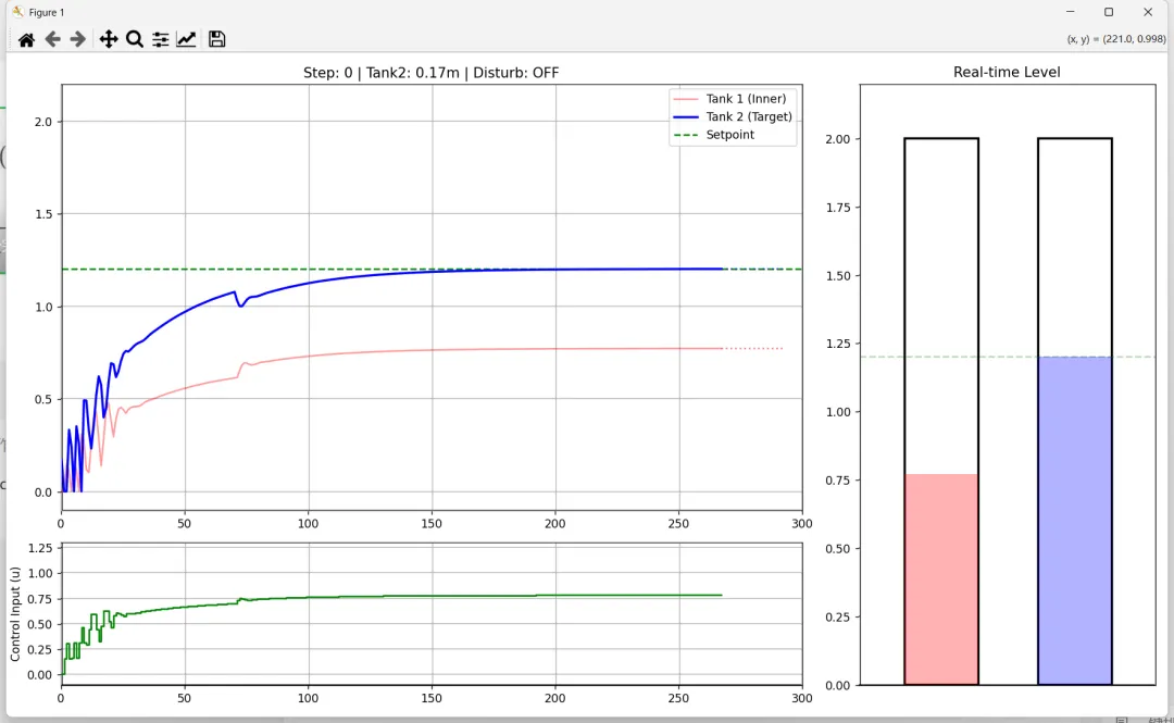- 1. 稳态追踪:系统在经历初始调节后,Tank 2 的液位能够以极小的超调量稳定在 1.2m。