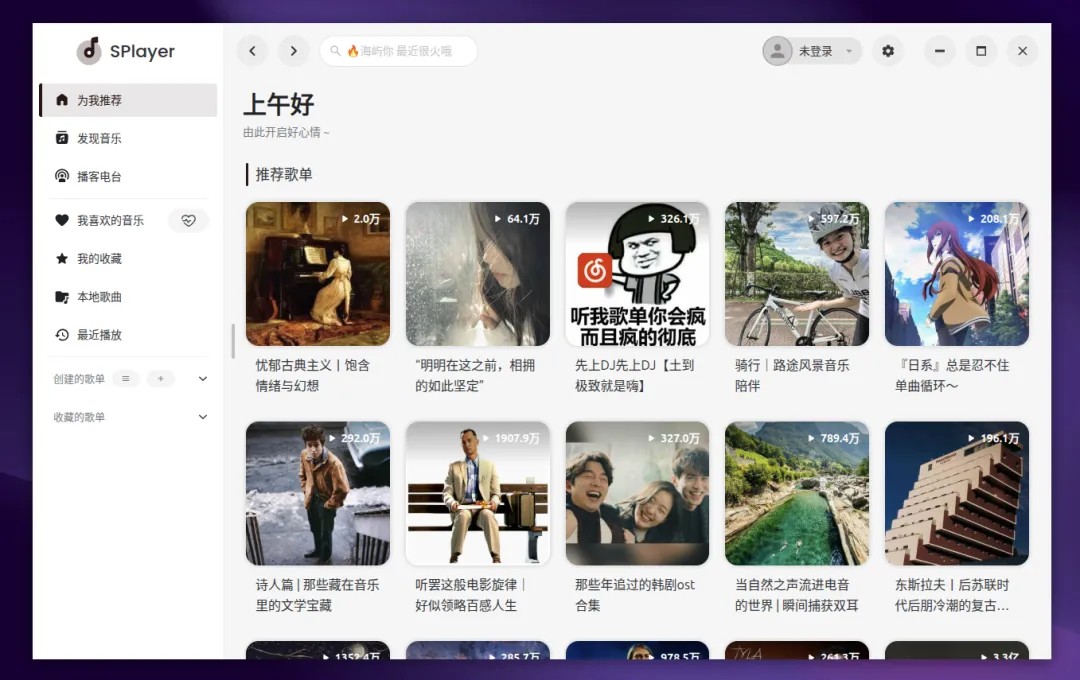 SPlayer是由 imsyy 开发的网易云音乐第三方播放器,可以免费畅听上面的歌曲。目前SPlayer主要支持Windows、Mac、Liunx三个系统的客户端,在PC端适配的比较全面,而且是一个Github开源项目。