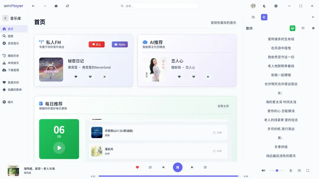 wmPlayer 一款开源简洁高颜值的酷狗第三方客户端,基于 Wails3 和 Go 技术栈开发的现代化音乐播放器,支持在线音乐播放、本地音乐管理、桌面歌词显示等丰富功能。