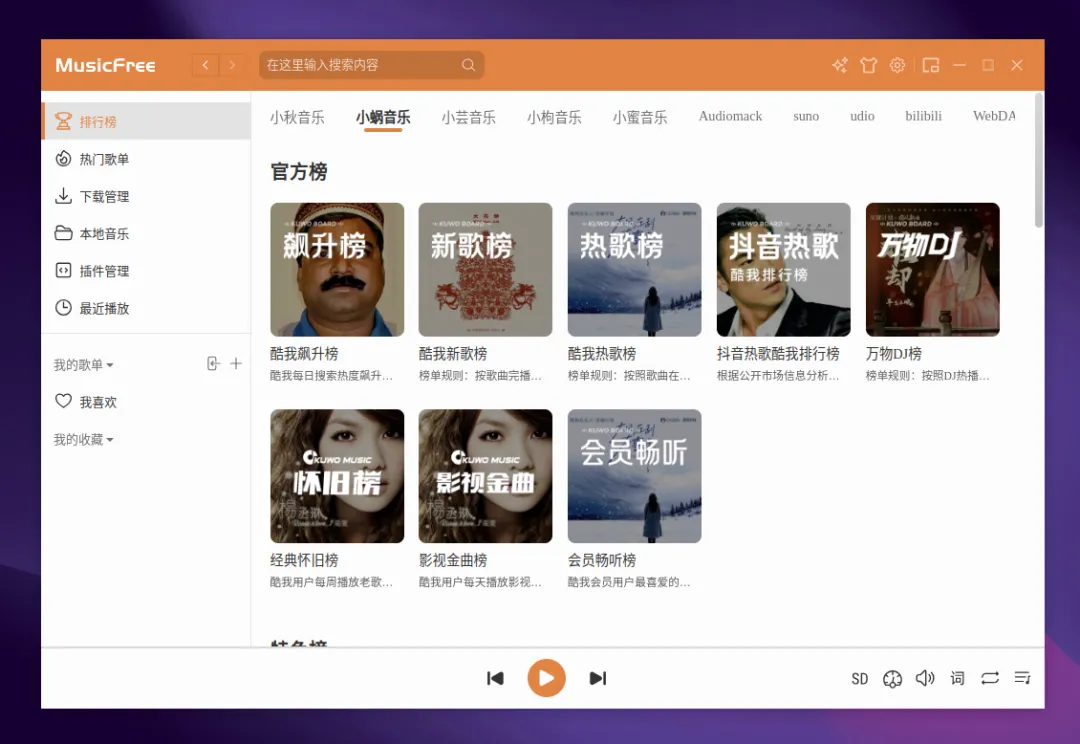 MusicFree 一款免费、开源的本地音乐播放器,同时支持Android、Windows、MacOS、Linux客户端,通过插件扩展实现定制化的个人音乐软件,无论是榜单、试听、下载等,支持QQ音乐、网易云音乐、酷我音乐等歌单导入功能。