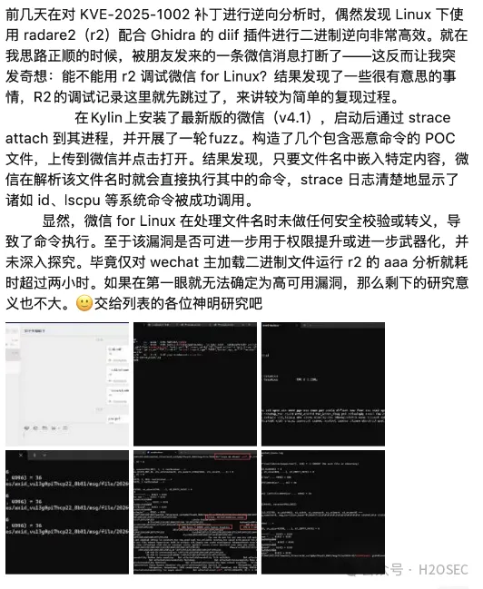 某信 for Linux 在处理用户接收的文件时,当用户点击打开包含恶意命令的文件名时,由于对文件名中的特殊字符(如分号、反引号、$()、换行符等)未进行充分过滤和转义,直接将文件名拼接进shell命令中执行,导致攻击者可通过构造恶意的文件名实现任意命令执行。