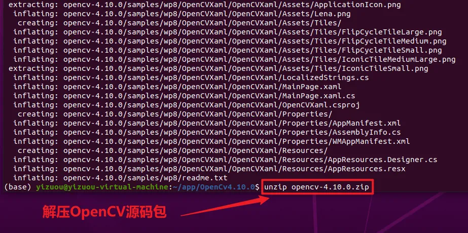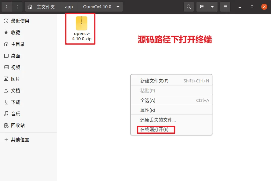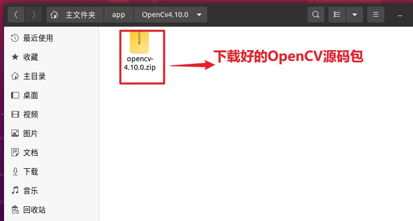 将下载的opencv-4.10.0.zip放到 Ubuntu 的指定目录(本文示例:~/app/OpenCv4.10.0/)
