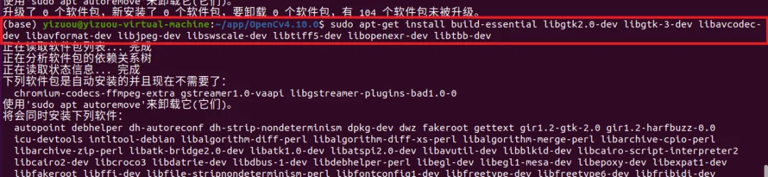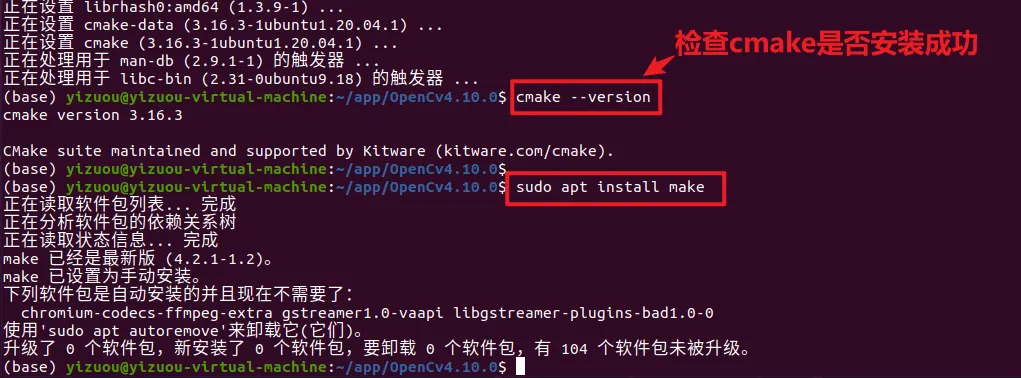 在进行 OpenCV 编译前,需要先安装 CMake、make 编译工具,以及 OpenCV 所需的基础依赖库,所有操作均在终端中执行。