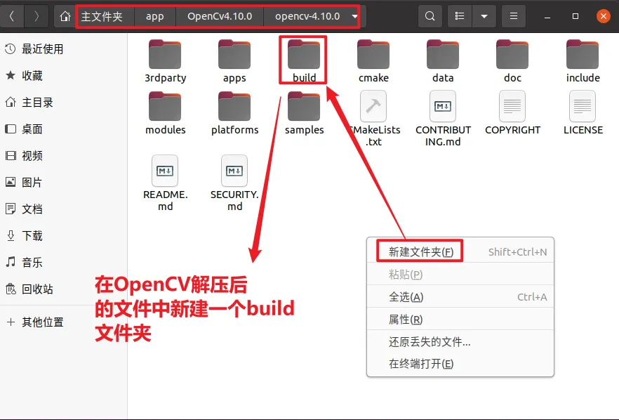 进入解压后的opencv-4.10.0目录,右键新建文件夹并命名为build,或通过终端执行: