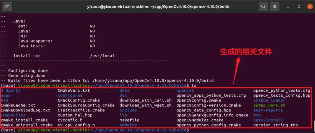 执行结果:终端会输出系统环境检测、依赖检测信息,最终显示Configuring done、Generating done即配置成功,build 目录下会生成 Makefile 及各类编译配置文件,如下: