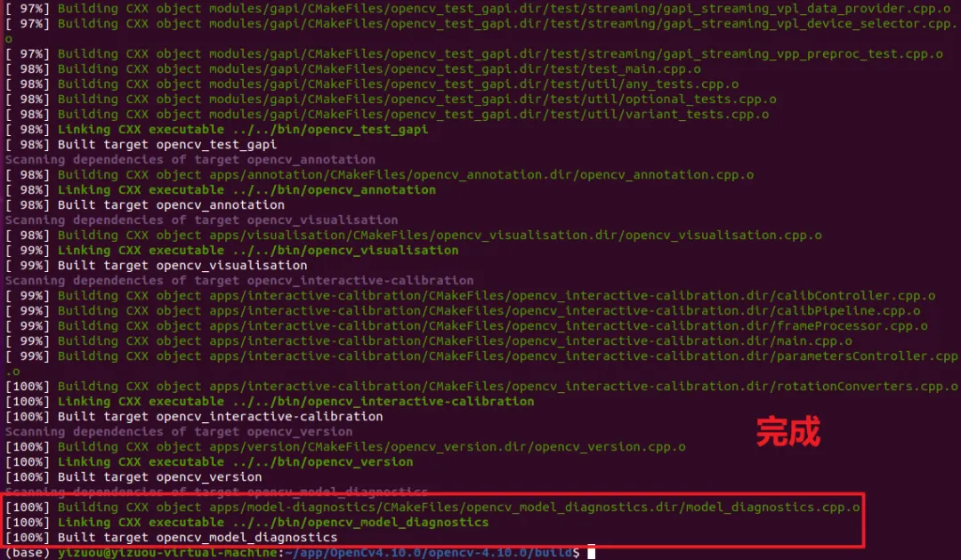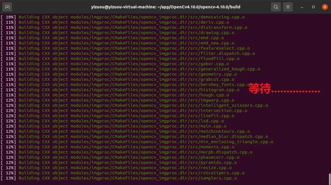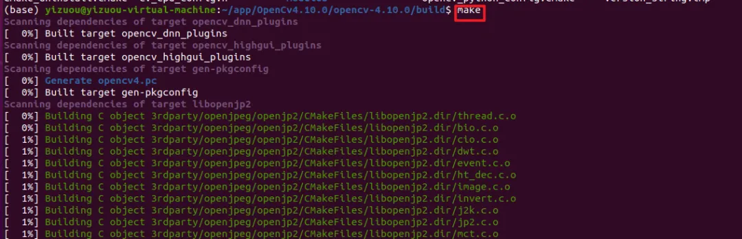 在 build 目录下执行make命令,调用 g++ 编译所有 OpenCV 源码文件,该过程耗时较长(根据电脑配置,约 10-30 分钟):