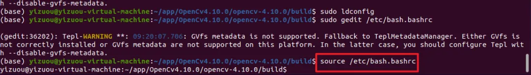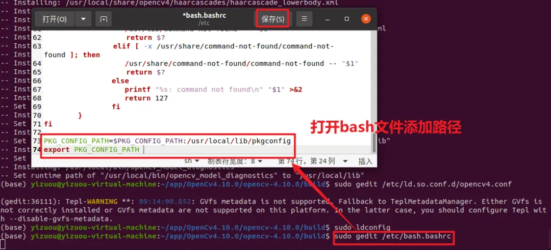 安装完成后,需要配置系统环境变量,让 Ubuntu 能识别 OpenCV 的库文件和 pkg-config 配置文件,否则运行程序时会出现库文件找不到的错误。