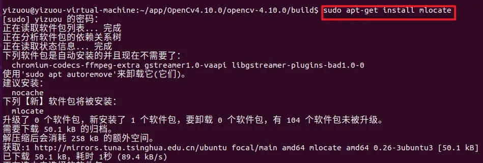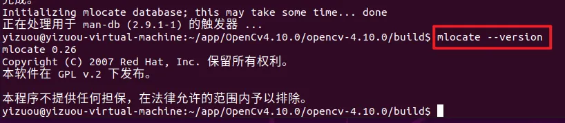 安装mlocate工具(包含locate命令),这是 Linux 的 “文件快速搜索工具”,能快速查找系统里的文件(比如验证 OpenCV 的配置文件是否存在。执行下面指令安装: