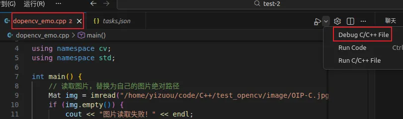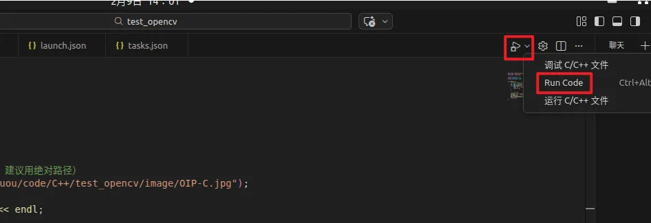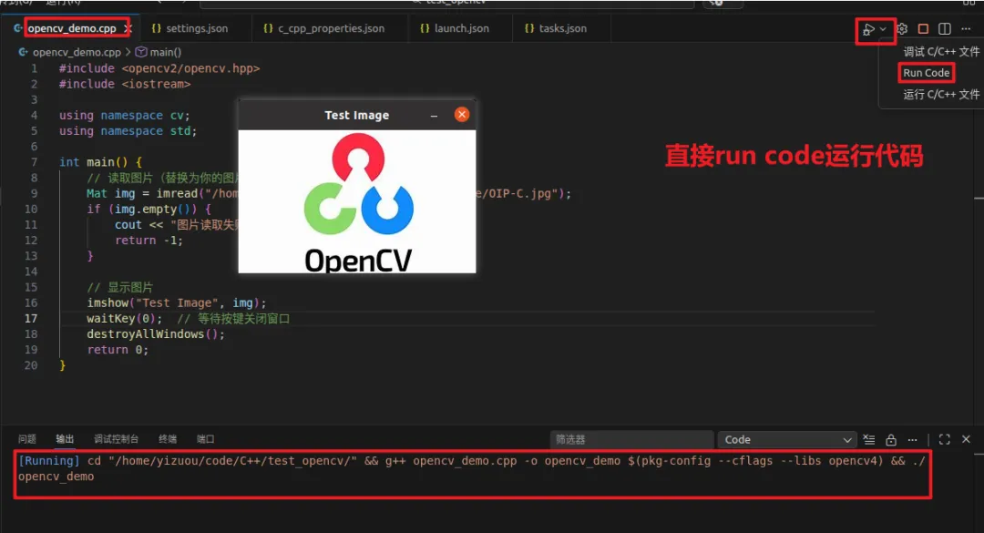 点 ▶ Run Code,执行的就不再是:g++ test.cpp -o test,而是:g++ test.cpp -o test $(pkg-config --cflags --libs opencv4)