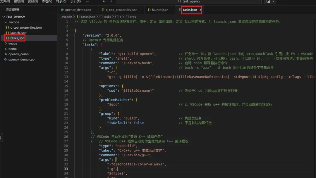 该文件定义 VSCode 的编译命令,核心是将 OpenCV 的编译链接参数融入 g++ 命令,实现一键编译。