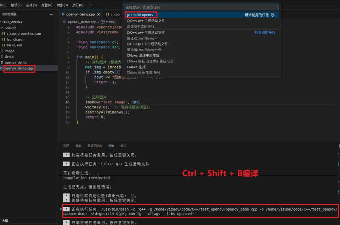从日志可以看到:cd "/home/yizuou/code/C++/test_opencv/" && g++ opencv_demo.cpp -o opencv_demo,根本没有:$(pkg-config --cflags --libs opencv4)。没有 -I/usr/local/include/opencv4,编译器自然找不到
