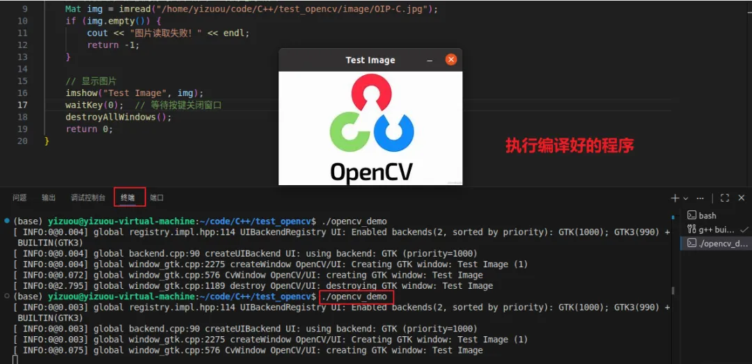 按下Ctrl+Shift+B,选择g++ build opencv,VSCode 会执行编译命令,编译成功后在终端中执行生成的可执行文件: