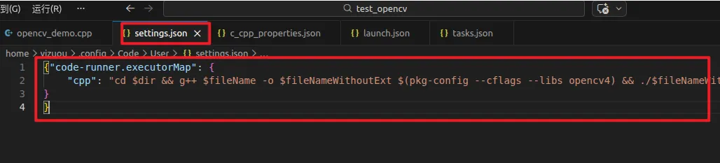 "code-runner.executorMap": {"cpp":"cd $dir && g++ $fileName -o $fileNameWithoutExt$(pkg-config --cflags --libs opencv4) && ./$fileNameWithoutExt"}