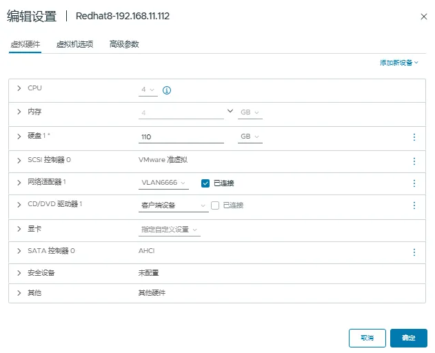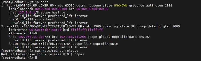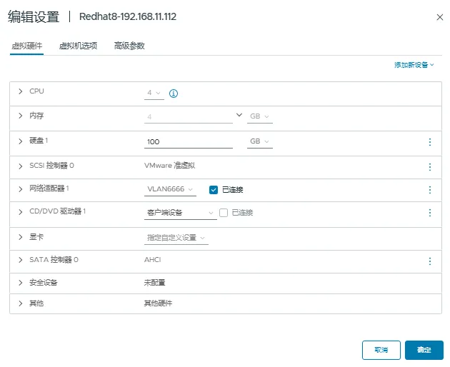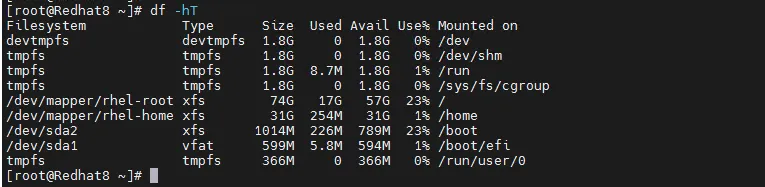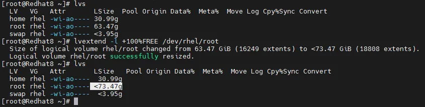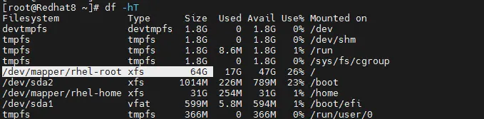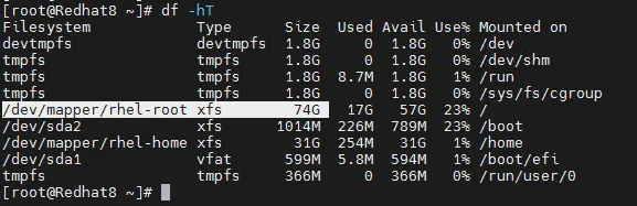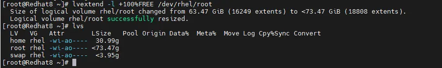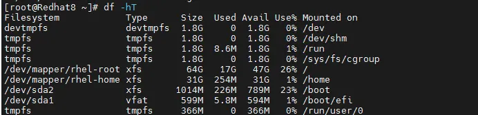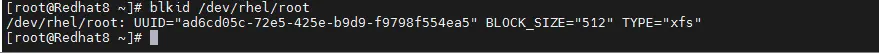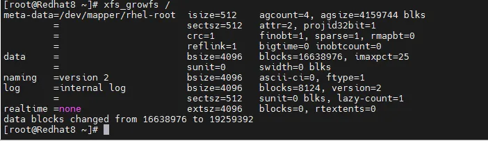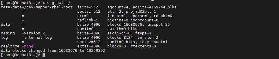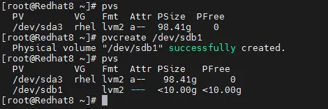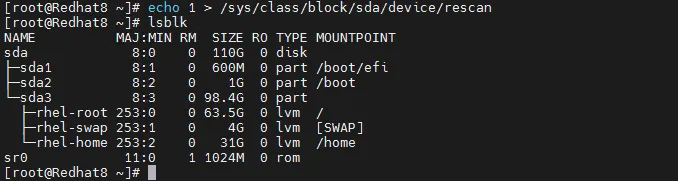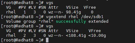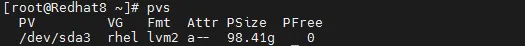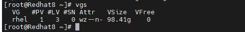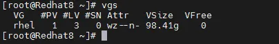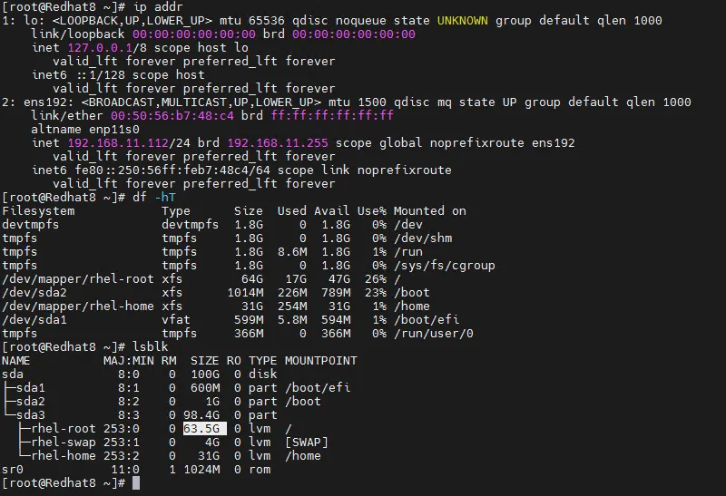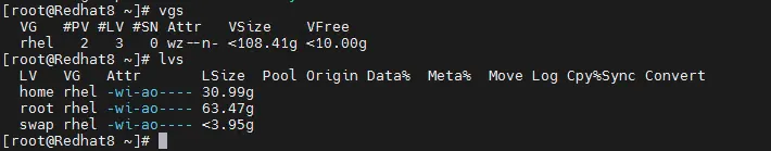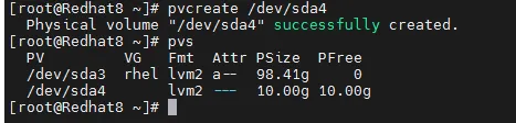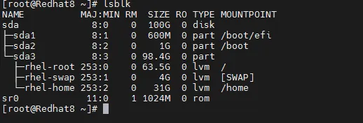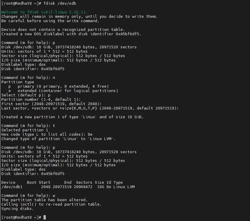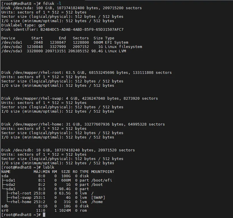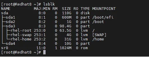 [root@Redhat8 ~]# fdisk /dev/sda Welcome to fdisk (util-linux 2.32.1). Changes will remain in memory only, until you decide to write them. Be careful before using the write command. Command (m for help): p#查看当前分区表 Disk /dev/sda: 110 GiB, 118111600640 bytes, 230686720 sectors Units: sectors of 1 * 512 = 512 bytes Sector size (logical/physical): 512 bytes / 512 bytes I/O size (minimum/optimal): 512 bytes / 512 bytes Disklabel type: gpt Disk identifier: B24B4DC5-ADAB-4ABD-85F9-65D31507AFC7 DeviceStartEndSectorsSize Type /dev/sda1204812308471228800600M EFI System /dev/sda21230848332799920971521G Linux filesystem /dev/sda33328000 209713151 206385152 98.4G Linux LVM Command (m for help): n#创建新分区 Partition number (4-128, default 4): 4# 分区号,直接回车使用默认值 First sector (209713152-230686686, default 209713152):# 起始扇区,直接回车使用默认 Last sector, +sectors or +size{K,M,G,T,P} (209713152-230686686, default 230686686): # 结束扇区,直接回车使用整个硬盘 Created a new partition 4 of type 'Linux filesystem' and of size 10 GiB. Command (m for help): t#更改分区类型 Partition number (1-4, default 4): 4 Partition type (type L to list all types): 31设置LVM分区类型 Changed type of partition 'Linux filesystem' to 'Linux LVM'. Command (m for help): p# 验证分区表 Disk /dev/sda: 110 GiB, 118111600640 bytes, 230686720 sectors Units: sectors of 1 * 512 = 512 bytes Sector size (logical/physical): 512 bytes / 512 bytes I/O size (minimum/optimal): 512 bytes / 512 bytes Disklabel type: gpt Disk identifier: B24B4DC5-ADAB-4ABD-85F9-65D31507AFC7 DeviceStartEndSectorsSize Type /dev/sda1204812308471228800600M EFI System /dev/sda21230848332799920971521G Linux filesystem /dev/sda33328000 209713151 206385152 98.4G Linux LVM /dev/sda4209713152 2306866862097353510G Linux LVM Command (m for help): w#保存并退出 The partition table has been altered. Syncing disks. [root@Redhat8 ~]# |