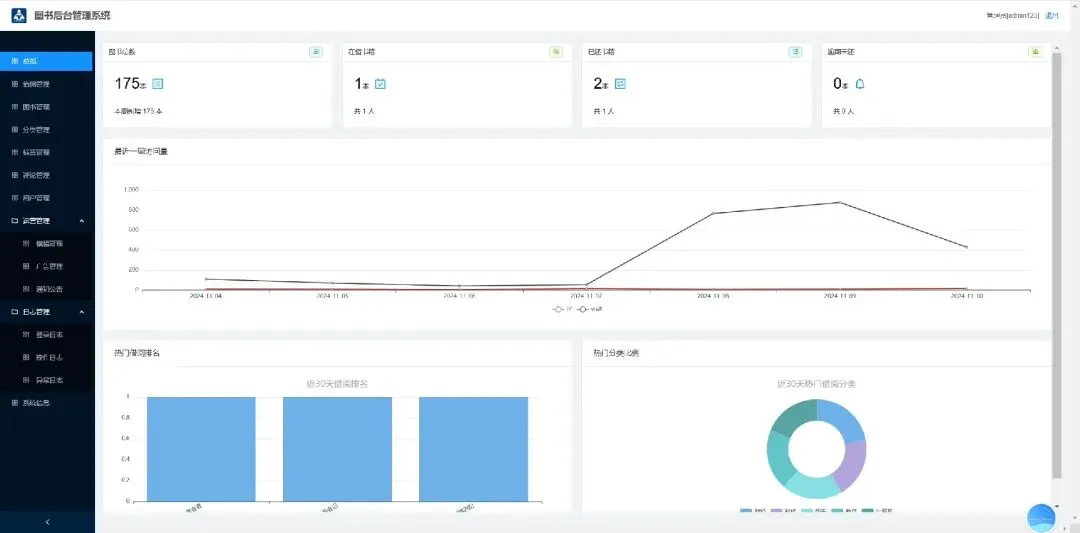 后台功能包括:总览、借阅管理、图书管理、分类管理、标签管理、评论管理、用户管理、运营管理、日志管理、系统信息模块。