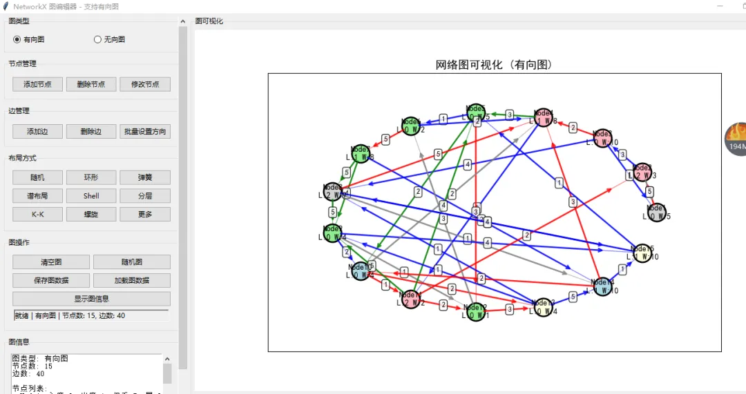 # -*- coding: utf-8 -*-# @Author : 小红牛# 微信公众号:wdPythonimport tkinter as tkfrom tkinter import ttk, messagebox, simpledialog, filedialogimport networkx as nximport matplotlib.pyplot as pltfrom matplotlib.backends.backend_tkagg import FigureCanvasTkAgg, NavigationToolbar2Tkfrom matplotlib.figure import Figureimport randomimport jsonimport osfrom collections import OrderedDictimport numpy as np# 设置中文字体,解决中文显示问题plt.rcParams['font.sans-serif'] = ['SimHei', 'Microsoft YaHei', 'DejaVu Sans']plt.rcParams['axes.unicode_minus'] = Falseclass GraphEditorApp:def __init__(self, root):self.root = rootself.root.title("NetworkX 图编辑器1.0 - 支持有向图")self.root.geometry("1300x900") # 增加高度# 创建 NetworkX 图对象 - 现在支持有向图self.G = nx.DiGraph() # 默认为有向图# 节点属性存储self.node_positions = {}self.node_colors = {}self.default_node_color = "lightblue"self.default_edge_color = "gray"# 当前选中的节点self.selected_node = None# 图类型(有向/无向)self.graph_type = "directed"# 布局self.setup_ui()# 绑定事件self.bind_events()# 初始化示例图self.create_sample_graph()def setup_ui(self):# 创建主框架main_frame = ttk.Frame(self.root)main_frame.pack(fill=tk.BOTH, expand=True, padx=5, pady=5)# 创建带滚动条的左侧控制面板left_container = ttk.Frame(main_frame)left_container.pack(side=tk.LEFT, fill=tk.Y, padx=(0, 5))# 创建Canvas和滚动条canvas = tk.Canvas(left_container, width=300, height=800)scrollbar = ttk.Scrollbar(left_container, orient="vertical", command=canvas.yview)scrollable_frame = ttk.Frame(canvas)# 配置Canvascanvas.configure(yscrollcommand=scrollbar.set)canvas.bind('<Configure>', lambda e: canvas.configure(scrollregion=canvas.bbox("all")))# 将可滚动框架放入Canvascanvas_window = canvas.create_window((0, 0), window=scrollable_frame, anchor="nw")# 当可滚动框架大小变化时,更新滚动区域scrollable_frame.bind("<Configure>", lambda e: canvas.configure(scrollregion=canvas.bbox("all")))# 当Canvas大小变化时,调整窗口宽度canvas.bind('<Configure>', lambda e: canvas.itemconfig(canvas_window, width=e.width))# 布局Canvas和滚动条canvas.pack(side="left", fill="both", expand=True)scrollbar.pack(side="right", fill="y")# 绑定鼠标滚轮事件def _on_mousewheel(event):canvas.yview_scroll(int(-1*(event.delta/120)), "units")canvas.bind_all("<MouseWheel>", _on_mousewheel)# 左侧控制面板内容control_frame = scrollable_frame# 图类型选择部分graph_type_frame = ttk.LabelFrame(control_frame, text="图类型", padding="10")graph_type_frame.pack(fill=tk.X, pady=(0, 10))self.graph_type_var = tk.StringVar(value="directed")type_btn_frame = ttk.Frame(graph_type_frame)type_btn_frame.pack(fill=tk.X)ttk.Radiobutton(type_btn_frame, text="有向图", variable=self.graph_type_var,value="directed", command=self.change_graph_type).pack(side=tk.LEFT, fill=tk.X, expand=True, padx=2)ttk.Radiobutton(type_btn_frame, text="无向图", variable=self.graph_type_var,value="undirected", command=self.change_graph_type).pack(side=tk.LEFT, fill=tk.X, expand=True, padx=2)# 节点管理部分node_frame = ttk.LabelFrame(control_frame, text="节点管理", padding="10")node_frame.pack(fill=tk.X, pady=(0, 10))# 使用网格布局使按钮更紧凑node_btn_frame = ttk.Frame(node_frame)node_btn_frame.pack(fill=tk.X)ttk.Button(node_btn_frame, text="添加节点", command=self.add_node_dialog).grid(row=0, column=0, sticky=tk.EW, padx=2, pady=2)ttk.Button(node_btn_frame, text="删除节点", command=self.delete_node_dialog).grid(row=0, column=1, sticky=tk.EW, padx=2, pady=2)ttk.Button(node_btn_frame, text="修改节点", command=self.edit_node_dialog).grid(row=0, column=2, sticky=tk.EW, padx=2, pady=2)# 配置网格权重node_btn_frame.columnconfigure(0, weight=1)node_btn_frame.columnconfigure(1, weight=1)node_btn_frame.columnconfigure(2, weight=1)# 边管理部分edge_frame = ttk.LabelFrame(control_frame, text="边管理", padding="10")edge_frame.pack(fill=tk.X, pady=(0, 10))edge_btn_frame = ttk.Frame(edge_frame)edge_btn_frame.pack(fill=tk.X)ttk.Button(edge_btn_frame, text="添加边", command=self.add_edge_dialog).grid(row=0, column=0, sticky=tk.EW, padx=2, pady=2)ttk.Button(edge_btn_frame, text="删除边", command=self.delete_edge_dialog).grid(row=0, column=1, sticky=tk.EW, padx=2, pady=2)ttk.Button(edge_btn_frame, text="批量设置方向", command=self.batch_set_edge_direction).grid(row=0, column=2, sticky=tk.EW, padx=2, pady=2)# 配置网格权重edge_btn_frame.columnconfigure(0, weight=1)edge_btn_frame.columnconfigure(1, weight=1)edge_btn_frame.columnconfigure(2, weight=1)# 布局管理部分layout_frame = ttk.LabelFrame(control_frame, text="布局方式", padding="10")layout_frame.pack(fill=tk.X, pady=(0, 10))# 第一行布局按钮row1_frame = ttk.Frame(layout_frame)row1_frame.pack(fill=tk.X, pady=(0, 5))ttk.Button(row1_frame, text="随机", command=self.random_layout, width=8).pack(side=tk.LEFT, fill=tk.X, expand=True, padx=2)ttk.Button(row1_frame, text="环形", command=self.circular_layout, width=8).pack(side=tk.LEFT, fill=tk.X, expand=True, padx=2)ttk.Button(row1_frame, text="弹簧", command=self.spring_layout, width=8).pack(side=tk.LEFT, fill=tk.X, expand=True, padx=2)# 第二行布局按钮row2_frame = ttk.Frame(layout_frame)row2_frame.pack(fill=tk.X, pady=(0, 5))ttk.Button(row2_frame, text="谱布局", command=self.spectral_layout, width=8).pack(side=tk.LEFT, fill=tk.X, expand=True, padx=2)ttk.Button(row2_frame, text="Shell", command=self.shell_layout, width=8).pack(side=tk.LEFT, fill=tk.X, expand=True, padx=2)ttk.Button(row2_frame, text="分层", command=self.multipartite_layout_dialog, width=8).pack(side=tk.LEFT, fill=tk.X, expand=True, padx=2)# 第三行布局按钮row3_frame = ttk.Frame(layout_frame)row3_frame.pack(fill=tk.X, pady=(0, 5))ttk.Button(row3_frame, text="K-K", command=self.kamada_kawai_layout, width=8).pack(side=tk.LEFT, fill=tk.X, expand=True, padx=2