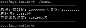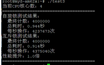 #include <stdio.h>#include <stdlib.h>#include <pthread.h>#include <unistd.h>#include <time.h>#define THREAD_NUM 8 // 线程数#define ADD_NUM 500000 // 每个线程累加次数// 共享计数器long long g_spin_count = 0;long long g_mutex_count = 0;// 自旋锁&互斥锁pthread_spinlock_t spinlock;pthread_mutex_t mutex = PTHREAD_MUTEX_INITIALIZER;// 自旋锁累加函数void* spin_add(void* arg){ (void)arg; for(int i=0; i<ADD_NUM; i++) { pthread_spin_lock(&spinlock); g_spin_count++; pthread_spin_unlock(&spinlock); } return NULL;}// 互斥锁累加函数void* mutex_add(void* arg){ (void)arg; for(int i=0; i<ADD_NUM; i++) { pthread_mutex_lock(&mutex); g_mutex_count++; pthread_mutex_unlock(&mutex); } return NULL;}// 耗时计算函数double calc_cost(struct timespec start, struct timespec end){ return (end.tv_sec - start.tv_sec) + (end.tv_nsec - start.tv_nsec) / 1e9;}int main(){ pthread_t tid[THREAD_NUM]; struct timespec start, end; double spin_cost, mutex_cost; // 检查CPU核心数 int cpu_num = sysconf(_SC_NPROCESSORS_ONLN); printf("当前CPU核心数:%d\n", cpu_num); // ========== 测试自旋锁性能 ========== pthread_spin_init(&spinlock, PTHREAD_PROCESS_PRIVATE); clock_gettime(CLOCK_MONOTONIC, &start); for(int i=0; i<THREAD_NUM; i++) { pthread_create(&tid[i], NULL, spin_add, NULL); } for(int i=0; i<THREAD_NUM; i++) { pthread_join(tid[i], NULL); } clock_gettime(CLOCK_MONOTONIC, &end); spin_cost = calc_cost(start, end); pthread_spin_destroy(&spinlock); // ========== 测试互斥锁性能 ========== clock_gettime(CLOCK_MONOTONIC, &start); for(int i=0; i<THREAD_NUM; i++) { pthread_create(&tid[i], NULL, mutex_add, NULL); } for(int i=0; i<THREAD_NUM; i++) { pthread_join(tid[i], NULL); } clock_gettime(CLOCK_MONOTONIC, &end); mutex_cost = calc_cost(start, end); pthread_mutex_destroy(&mutex); // ========== 输出结果 ========== printf("=====================================\n"); printf("自旋锁测试结果:\n"); printf(" 最终计数:%lld\n", g_spin_count); printf(" 总耗时:%.3f秒\n", spin_cost); printf(" 每秒操作:%.0f次\n", (double)(THREAD_NUM*ADD_NUM)/spin_cost); printf("互斥锁测试结果:\n"); printf(" 最终计数:%lld\n", g_mutex_count); printf(" 总耗时:%.3f秒\n", mutex_cost); printf(" 每秒操作:%.0f次\n", (double)(THREAD_NUM*ADD_NUM)/mutex_cost); printf("性能提升:%.1f倍\n", mutex_cost/spin_cost); printf("=====================================\n"); return 0;}运行结果(4 核 CPU)