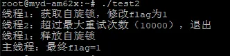 pthread_spin_lock持有锁,模拟短时间操作;pthread_spin_trylock非阻塞加锁,失败则轮询重试,超过最大次数则退出;#include <stdio.h>#include <stdlib.h>#include <pthread.h>#include <unistd.h>#include <errno.h>#define MAX_RETRY 10000 // 最大轮询次数// 共享状态标志int g_flag = 0;// 自旋锁pthread_spinlock_t spinlock;// 线程1:持有锁修改标志void* thread1(void* arg){ (void)arg; // 加锁 pthread_spin_lock(&spinlock); printf("线程1:获取自旋锁,修改flag为1\n"); g_flag = 1; // 模拟短时间持有锁(1ms) usleep(1000); // 解锁 pthread_spin_unlock(&spinlock); printf("线程1:释放自旋锁\n"); return NULL;}// 线程2:非阻塞轮询加锁void* thread2(void* arg){ (void)arg; int retry = 0; while(retry < MAX_RETRY) { // 非阻塞加锁 int ret = pthread_spin_trylock(&spinlock); if(ret == 0) { // 加锁成功 printf("线程2:第%d次尝试,获取自旋锁,flag=%d\n", retry+1, g_flag); g_flag = 2; printf("线程2:修改flag为2,释放自旋锁\n"); pthread_spin_unlock(&spinlock); break; } else if(ret == EBUSY) { // 锁被占用,继续轮询 retry++; // 轮询间隔(可选,降低CPU占用) // usleep(1); } else { printf("线程2:加锁失败,错误码=%d\n", ret); break; } } if(retry >= MAX_RETRY) { printf("线程2:超过最大重试次数(%d),退出\n", MAX_RETRY); } return NULL;}int main(){ pthread_t tid1, tid2; // 初始化自旋锁 pthread_spin_init(&spinlock, PTHREAD_PROCESS_PRIVATE); // 创建线程1(先持有锁) pthread_create(&tid1, NULL, thread1, NULL); usleep(100); // 确保线程1先执行 // 创建线程2(轮询加锁) pthread_create(&tid2, NULL, thread2, NULL); // 等待线程完成 pthread_join(tid1, NULL); pthread_join(tid2, NULL); // 销毁自旋锁 pthread_spin_destroy(&spinlock); printf("主线程:最终flag=%d\n", g_flag); return 0;}运行结果