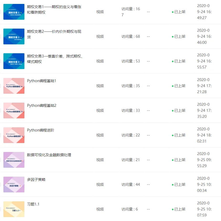 1、量化投资基础:主要涵盖了量化投资领域的必备知识,包括:基本面分析、技术分析、数量分析、固定收益、资产组合管理、权益、另类投资等内容。