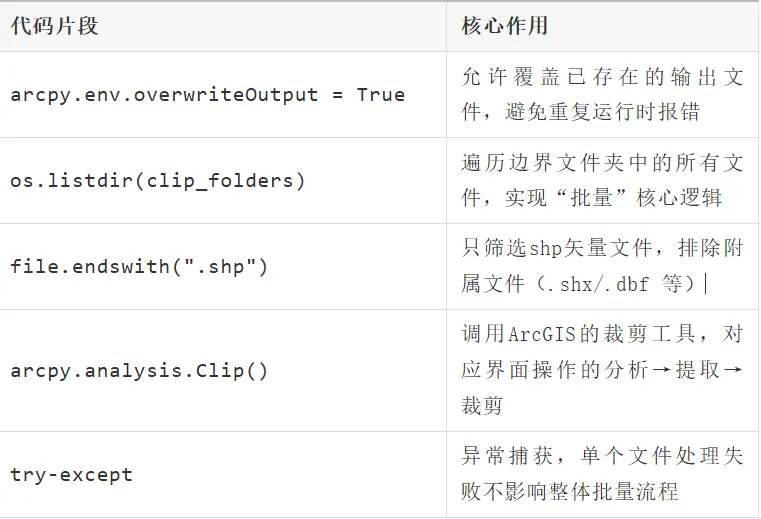 掌握这个批量处理逻辑后,可直接修改核心工具函数,适配自然资源、土地管理的更多场景:批量投影转换:把arcpy.analysis.Clip()换成arcpy.management.Project(),批量统一所有土壤/土地等矢量数据的投影;批量属性统计:调用arcpy.analysis.Statistics(),批量统计每个区域的土壤有机质含量均值/最大值;批量格式转换:调用arcpy.conversion.FeatureClassToShapefile(),批量将GDB中的要素类导出为shp文件。