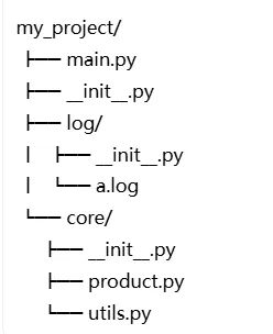 以上目录结构是一个典型的项目架构,其中my_project可以认为是你的项目根目录(也是包模块),包含了主程序main.py与初始化文件__init__.py(这个文件也是区分包模块与单纯的目录的区别)。根目录包含了2个子目录log和core,分别是记录日志和核心业务逻辑的。在子目录下面又分别有不同的文件。