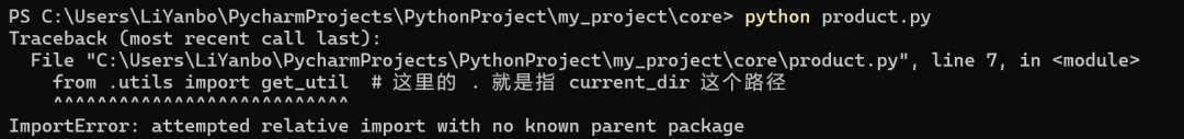当你直接运行 python core/product.py 时,Python 认为 product.py 是一个独立的脚本,不属于任何包。此时,product.py 的 __package__ 是 None,Python 不知道 . 指的是哪个目录,所以找不到 utils.py。