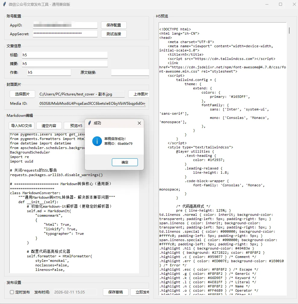 用 Tkinter 实现一个功能完整的微信公众号文章自动发布工具,包含配置管理、图文编辑、Markdown 转 HTML、图片上传、立即发布和定时发布等核心功能,并且界面要符合运营人员的使用习惯。