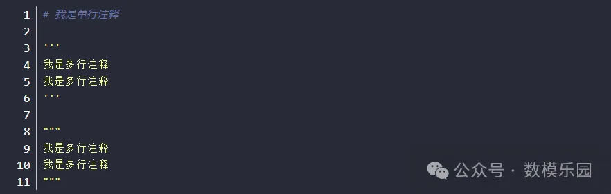 Python 中单行注释使用 #,多行注释使用三个单引号(''')或三个双引号(""")。如下所示: